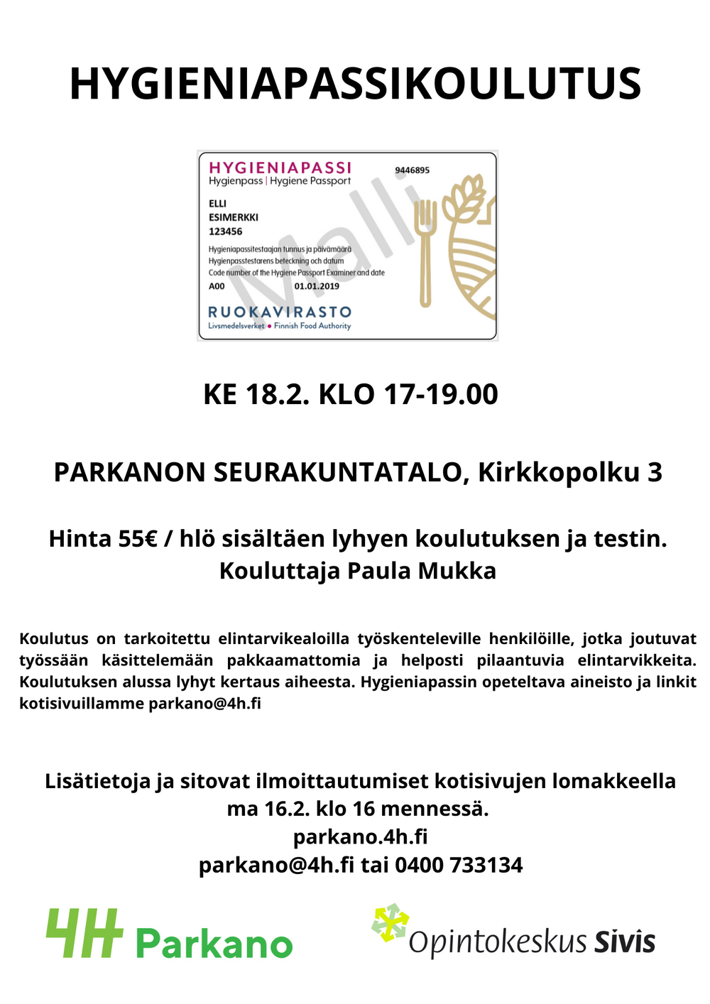 Hygienapassi- koulutus 18.2.2026 klo 17-19. Sitovat ilmoittautumiset alla olevalla lomakkeella tai yhteystietoineen sähköpostilla parkano@4h.fi. Lisätietoja 4H-yhdistyksestä.