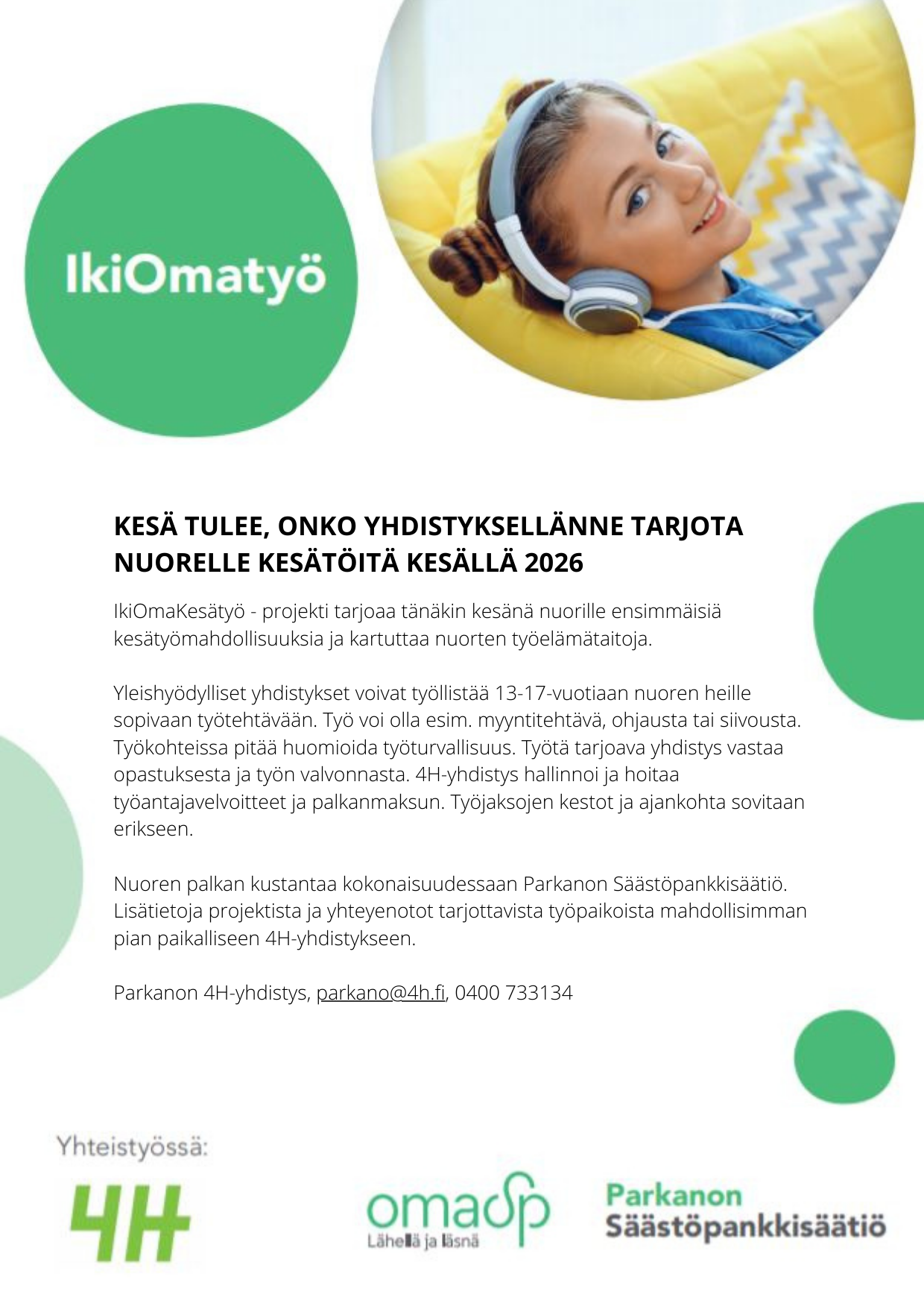 Parkanon Säästöpankkisäätiön rahoittaman Ikioma-kesätyö mahdollistaa nuorien työllistymisen yleishyödyllisissä yhdistyksissä, kuten kyläseurat, Setlementti, MLL, Parkanon seudun mobilistit ja 4H-yhdistys.
